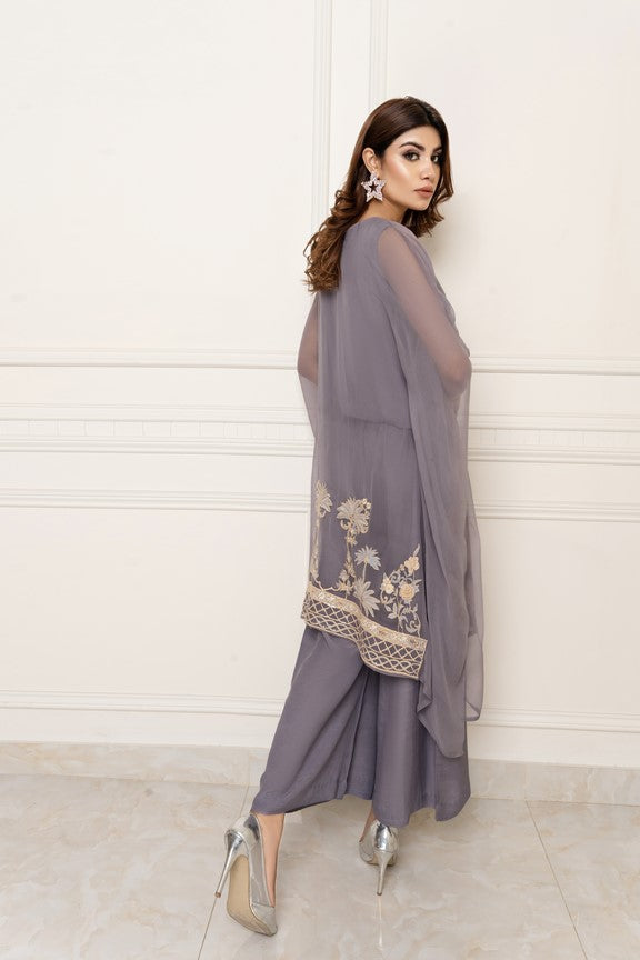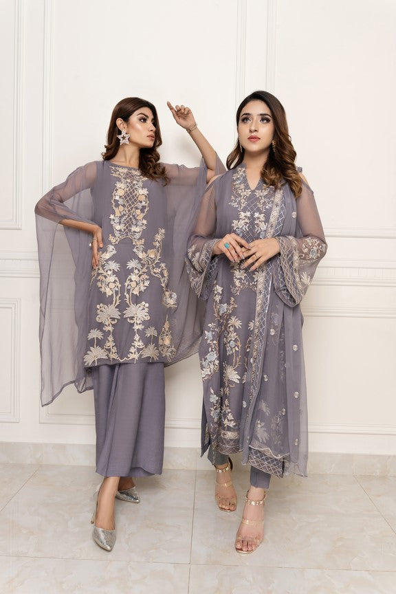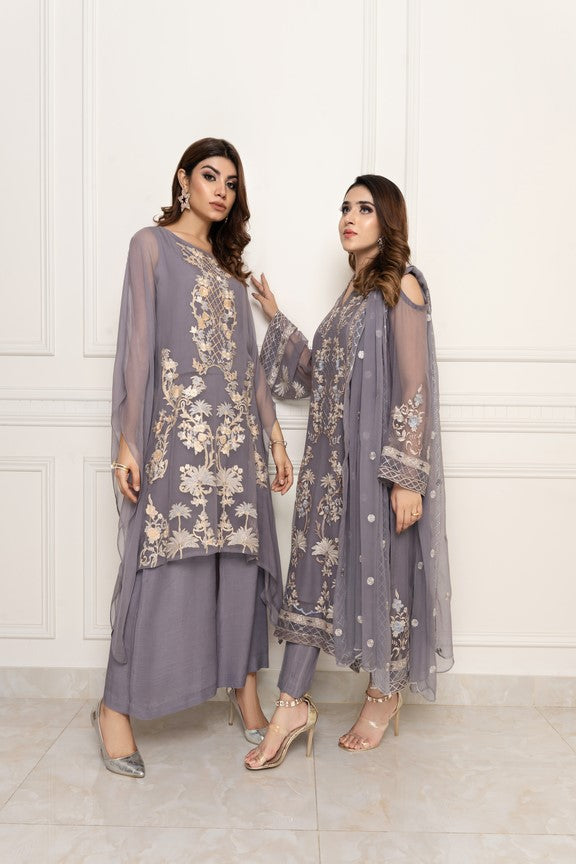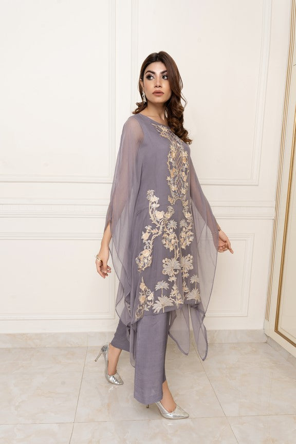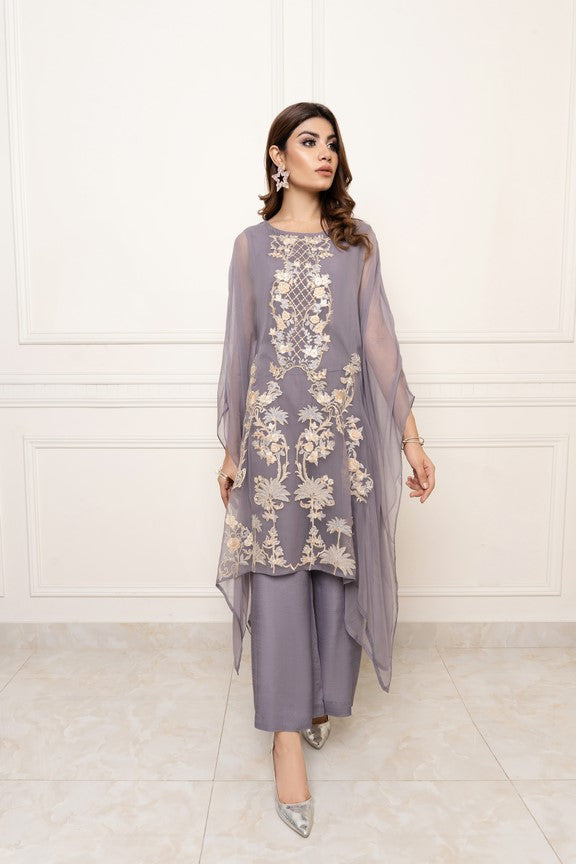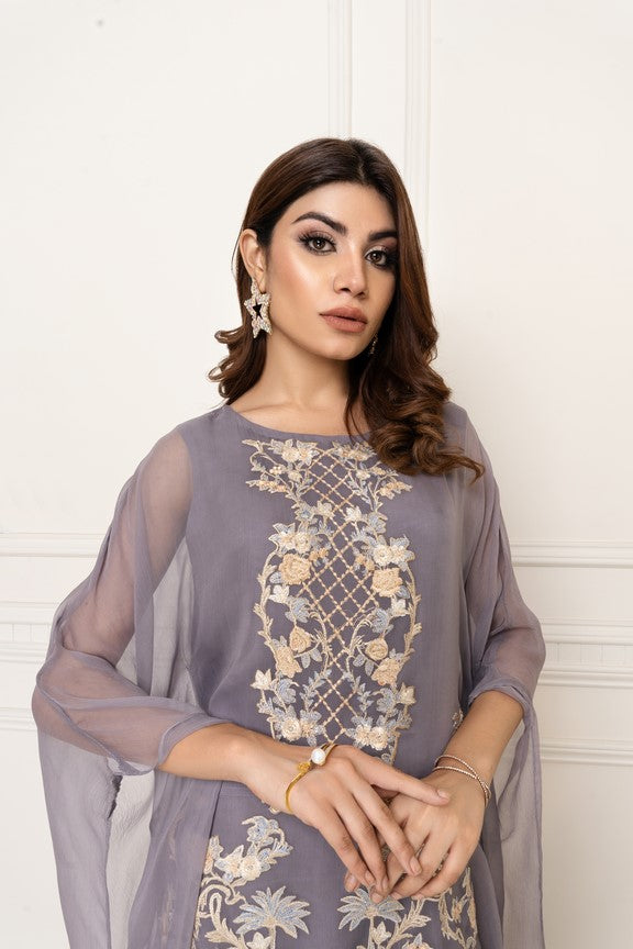 This gray chiffon outfit is adorned with pastel shades of pinks and cream of lemon color.