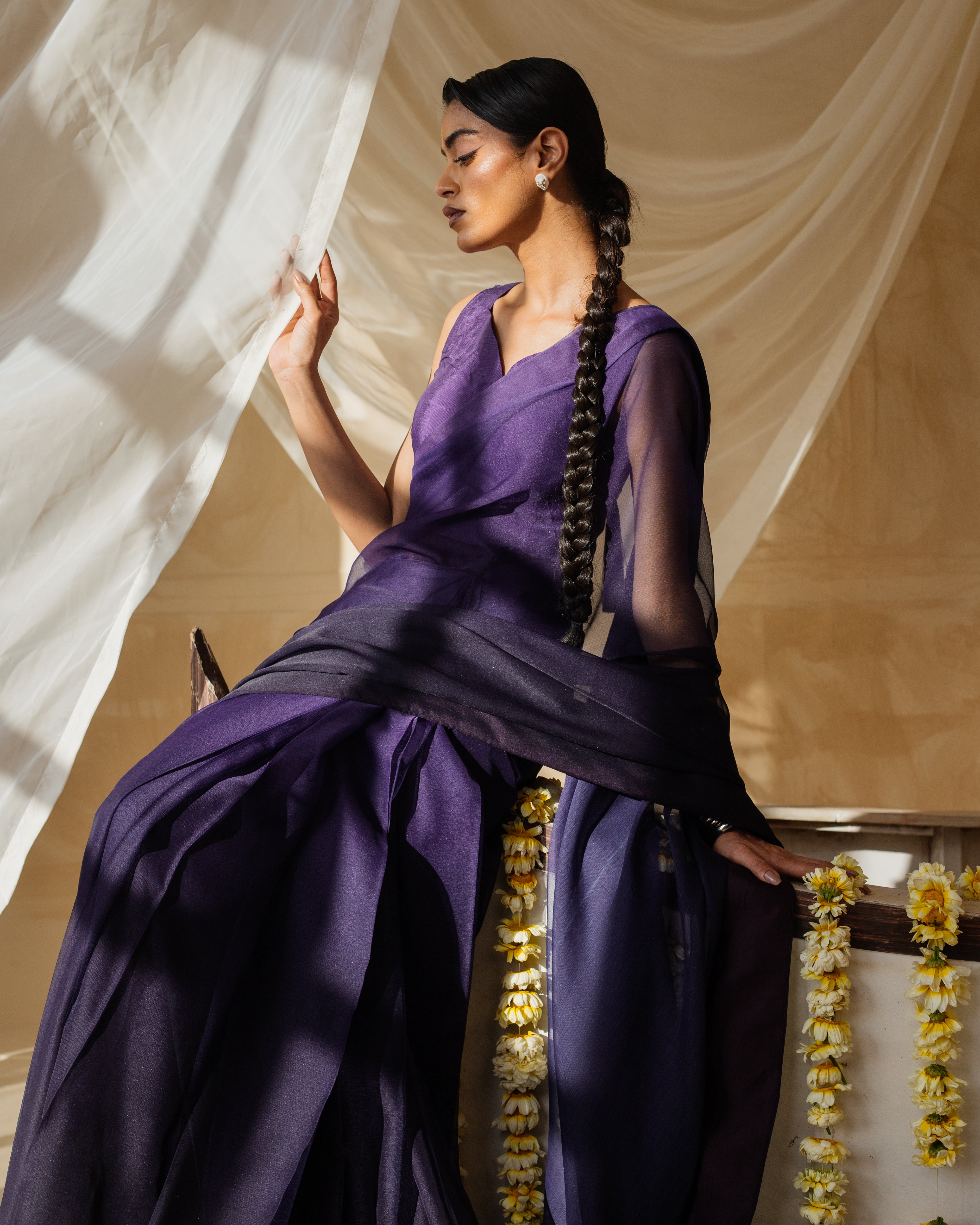Make a bold statement with our Royal Purple Saree. This luxurious color is perfect for evening events and special occasions. The rich fabric drapes beautifully, providing a regal look that is sure to turn heads.